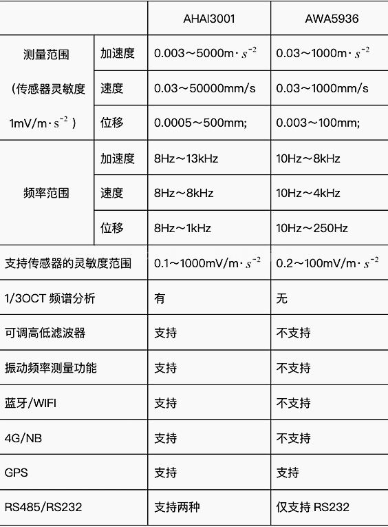 三、爱华新一代工作测振仪AHAI3001与AWA5936测振仪的技术参数对比图: