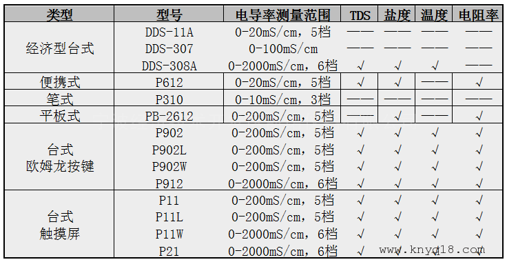 我们常常根据客户不同的应用场景需求为客户推荐不同的电导率仪,如实验室常用的台式电导率仪,测量范围广、精度高、功能更多。如果需要移动测试,推荐便携式和笔式电导率仪,便携式电导率仪相对功能更加多一些,笔式电导率仪测量范围一般较小,主要用于常规水溶液检测。实验室用电导率仪推荐经济型DDS-11A、DDS-307、DDS-308A型,多功能P902、P912型和触摸屏P11、P12型;便携式推荐P612型,还有同时可测PH/电导率/离子浓度等可选P613型。