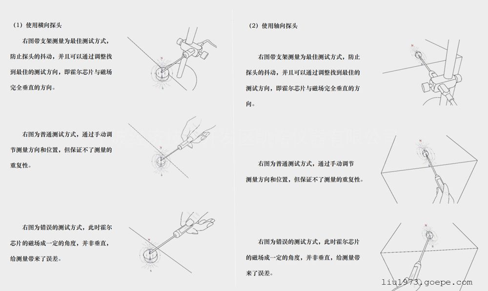 在直流磁场测量模式下,探头方向影响高斯计读数的极性。注意:为达蕞佳效果,使用前高斯计和探头应樶少预热 5 分钟,预热 30 分钟后达到额定精度。如果实际磁场方向未知,按 Max Hold 键开启峰值测量功能,并缓慢调整探头。随探头转动以及测量场强涨落,其峰值读数保留于显示中,记录取得峰值时的探头方向以确定磁场方向。严格测量前,探头应首先校零,以消除探头零点漂移或环境微小磁场的影响。温度也将影响探头精度,请尽量将探头置于20℃附近温度下使用。注意:高精度的测量要考虑环境的磁干扰,和实验室的电源是否稳定,是否按要求接地;如果测试物体多点磁场强度,应尽量保持探头固定,被测物体移动。