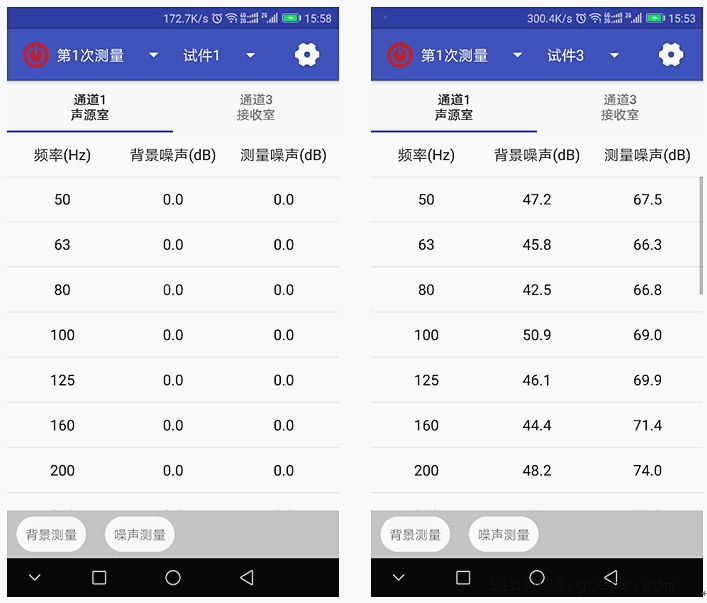 通过平板建筑声学测试软件操作引导测得门窗构件试件1和试件2隔声数据如下图所示,数据可以随时导出编辑。