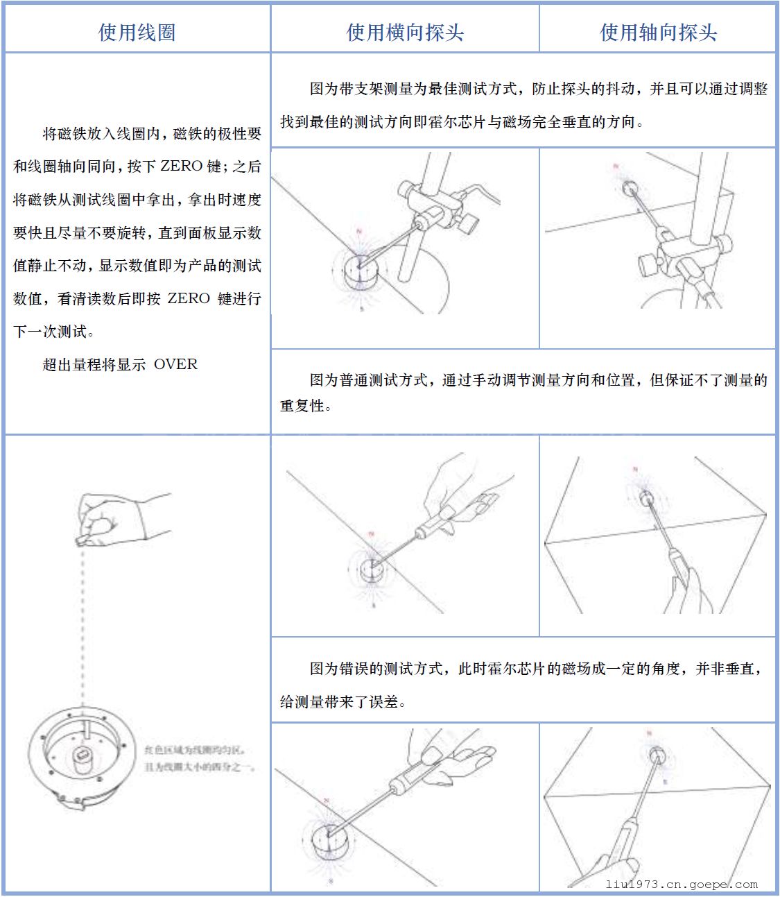 3.将清零后的高斯计探头褪出保护套放回被测磁场区域进行读值,请不要将保护套摘下,测量完毕后可将探头缩回保护套内。请注意所使用的探头类型,不同的探头类型其测试方式与测试位置及方向都不尽相同。
