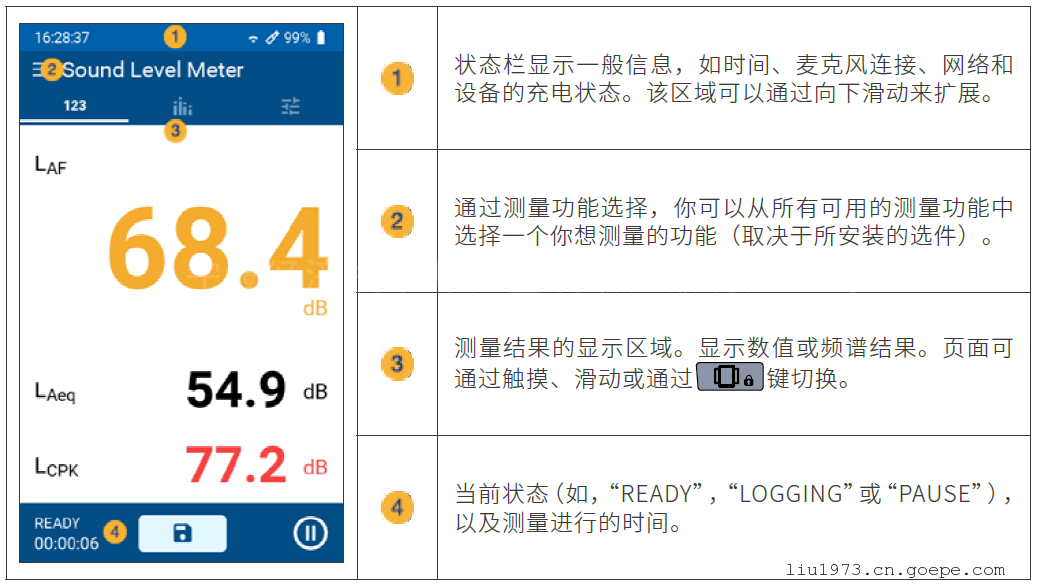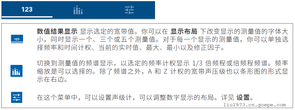 声压级测量功能提供了数字和频谱显示,你可以通过按键以及触摸屏选择: