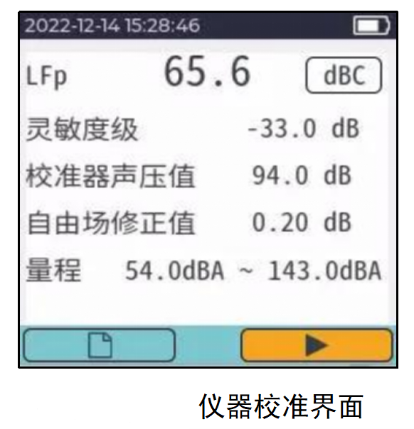 在主界面按向上/下键选中“校准”,后按确认键即可进入声校准界面。注:仪器出厂前已经校准过,图中显示的是出厂时校准或上次使用时校准保存的校准数据。如果测量标准要求或过了一段时间,使用前应对仪器重新进行声校准。声校准要求使用满足GB/T 15173/IEC 60942标准要求的2级或2级以上声校准器,例如AWA6022A型声校准器,它的工作频率为1000 Hz。