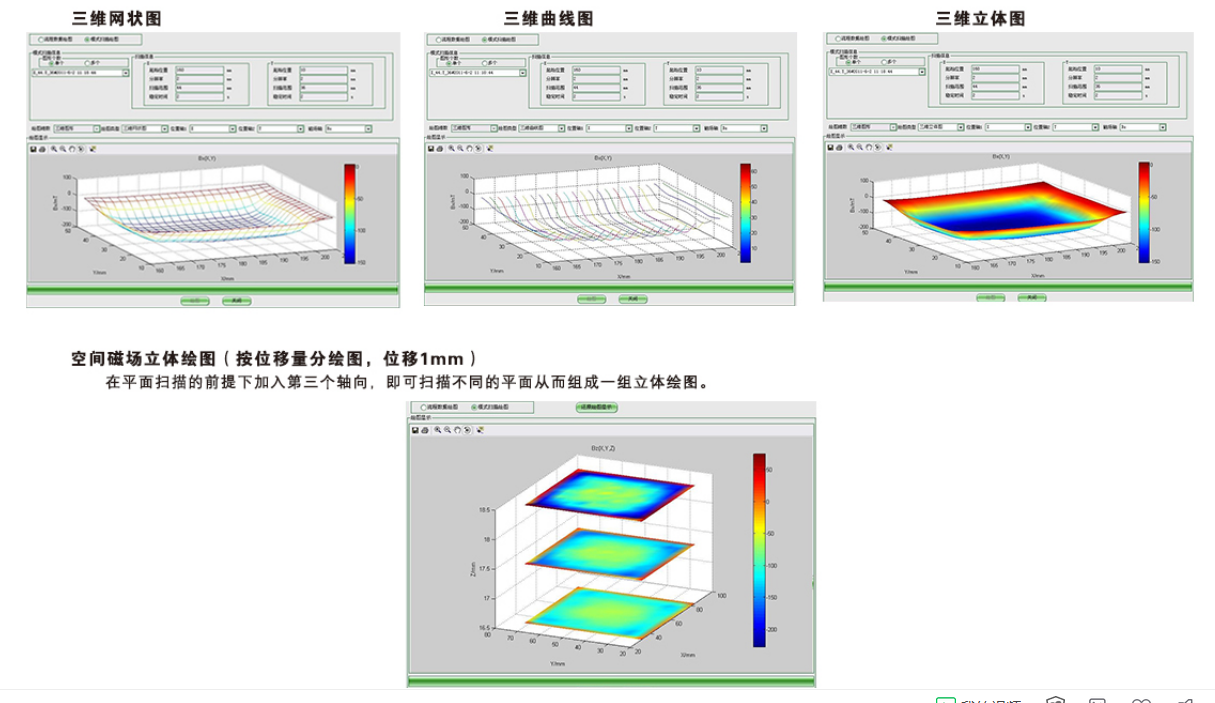 翠海F-30多维磁场测试系统由高精度多维数控微动平台及高精度数字高斯计及控制采集系统软件组成,主要用于电机领域三维磁场高精度测试,角度磁场分析,整体三维磁场分布立体成像等方面,可高精度测试空间磁场(一维;二维;三维)分布,各种形状磁体表磁立体分布,均匀性分布,N/S磁极分布等诸多磁场特性测试,绘制各种(一维;二维;三维)图形,存储数据并保存打印。可测试方形,圆形,圆柱体,多极磁环及各类不规则形状磁体及空间场,适用于各类磁性材料。空间磁场,电机内磁场等多方面研究。F-30多维磁场测试系统主要应用磁场如下: