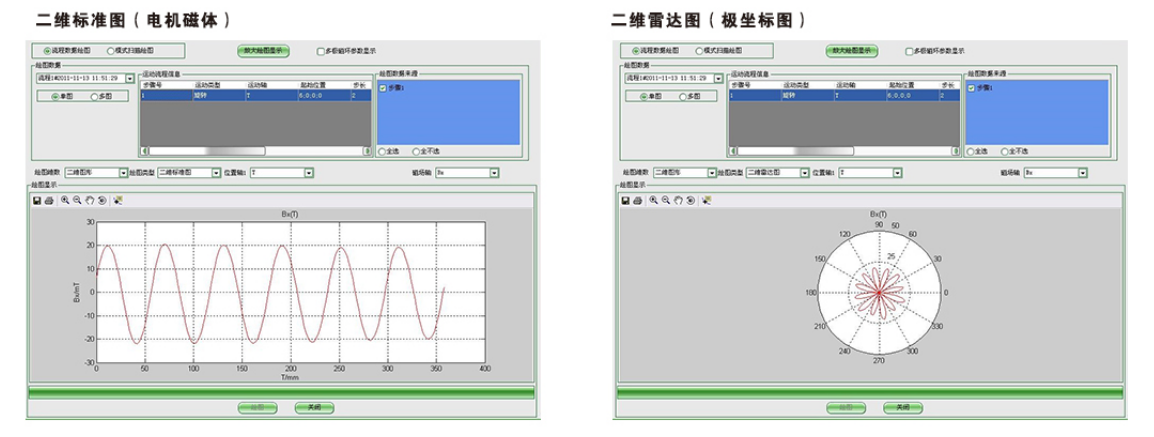 ●流程控制 - 使用流程控制时需要先对运动台的运动路径进行测量,在选择好路径后按照先后顺序依次输入各个轴向的移动步长和步数。在运动台运动时会按照已经设定好的路径带着探头进行移动从而测量路径上各个点的磁场大小。流程控制也用来测量在一个平面内一条线上的磁场大小并可绘制成曲线。用于高精度运动台时,运动控制的分辨率可达到微米。