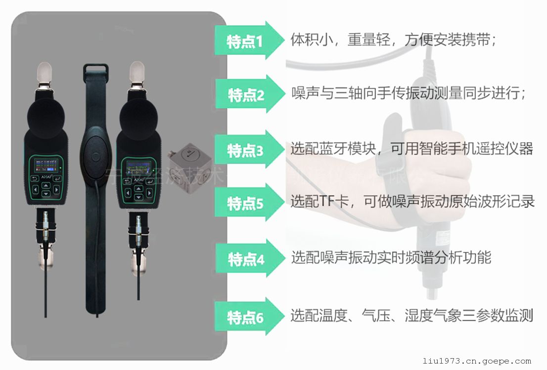 5.手传振动测量功能:同步测量三个轴向上振动对手部的影响,包含加速度a、awh4h等
