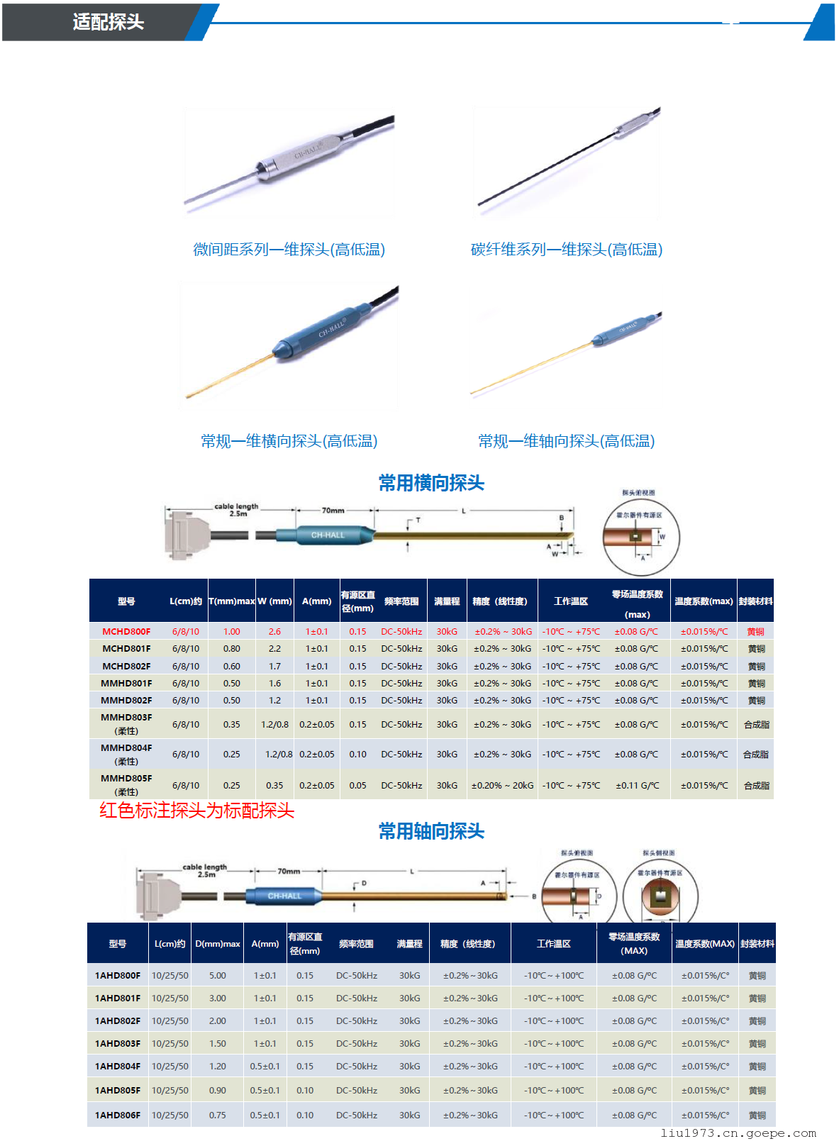 CH-1500型高斯计配用翠海(Ch-Hall/CH-MagTech)全系列一维横向和轴向探头。探头出厂前已进行校准,并储存校正信息于数字化探头中,不同探头具有完全互换性。宁波凯诺仪器为翠海磁磁通计/高斯计/特斯拉计等磁性性能测试产品特约代理商,欢迎新老客户来电咨询。