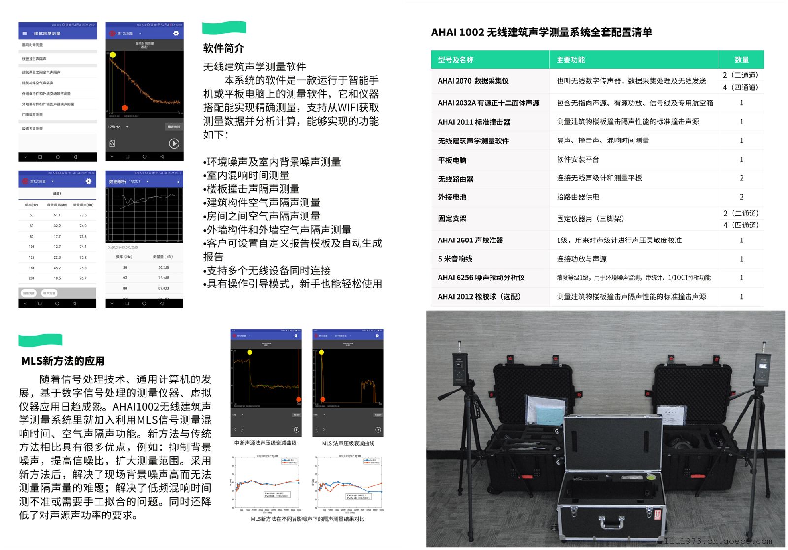 3.扩声特性测量(后期可在本套测量系统增加部分配件直接扩项):传输[幅度]频率特性、传声增益、声场不均匀度、*大声压级、总噪声级、系统总噪声级、系统总谐波失真、早后期声能比、背景噪声、反射声时间分布、再生混响时间、语言传输指数STIPA二、AHAI1002爱华智能无线建筑声学测量系统新升级产品特点:
