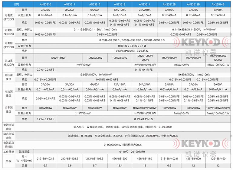 三、高精度可编程直流电子负载艾诺AN23500系列规格参数: